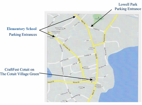 Whether arriving in Cotuit via Main Street, Putnam Avenue or School Street, watch for the “FREE Parking” signs directing you to the following free parking areas, reserved all weekend for visitors to CraftFest.